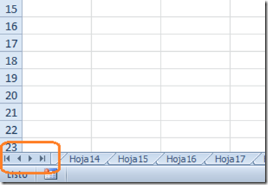 Desplazamiento de hoja: Pulsando directamente en la celda de destino, utilizando las teclas con flecha, se accede a cada una de las hojas haciendo clic sobre la solapa correspondiente, situadas a la parte inferior izquierda de la pantalla. Si la solapa de la hoja que se quiere activar no está visible, se pueden utilizar los botones de desplazamiento de etiquetas, a la izquierda de las solapas de hojas, haciendo clic sobre uno de ellos. De izquierda a derecha su función es la de activar: la primera hoja, la hoja anterior, la hoja siguiente y la última hoja.
