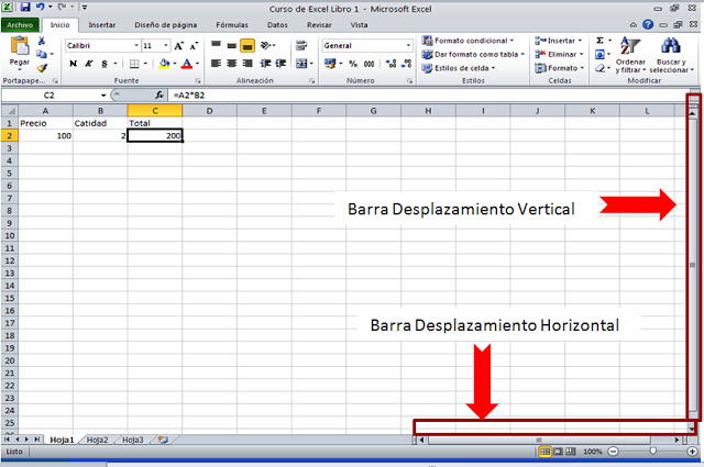 Barra de desplazamiento vertical: Las barras de desplazamiento contienen botones de comandos que sirven para moverse a lo largo o ancho del área de trabajo de forma rápida y sencilla.